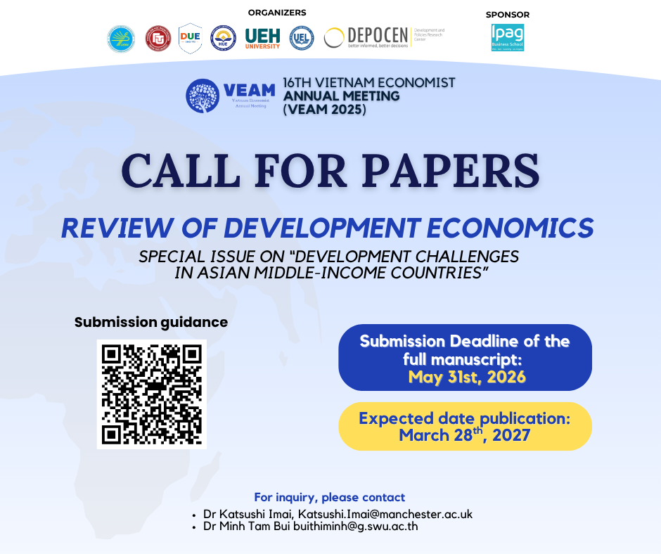 VEAM 2025 is pleased to welcome submissions from Early Career Researchers (ECRs) for a special issue of the Review of Development Economics (RDE), titled “Development Challenges in Asian Middle-Income Countries”.